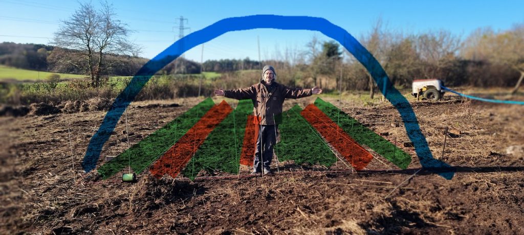In the photo below, the green sections are beds, 3′, 4′, 4′ and 3′ with 2′ orange paths between them. The doors at each end will be the width of my outreached hands and the blue curve will be the shape of the plastic.