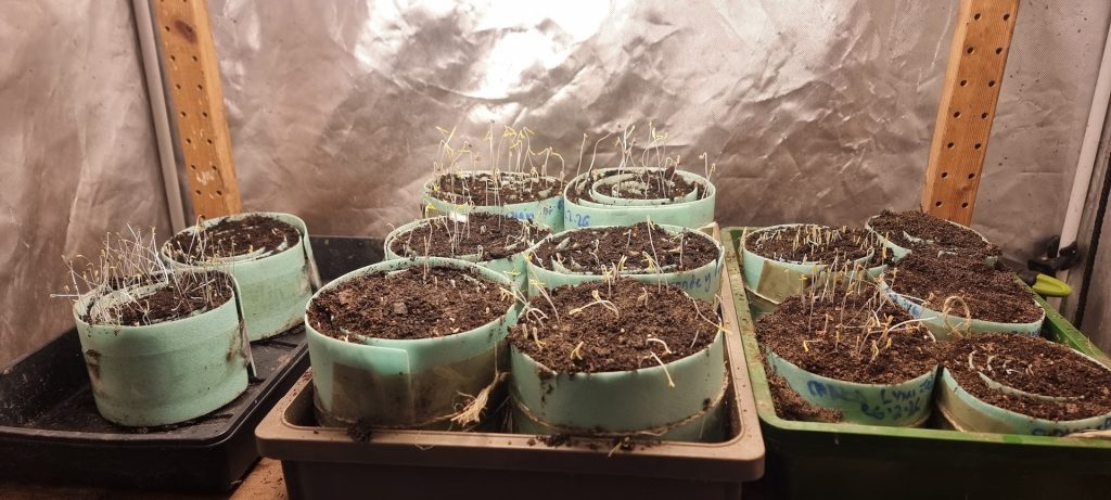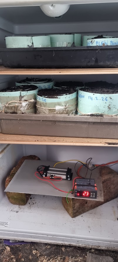 The Sanctuary Garden version is an undercounter fridge with an ST1000 controller and a 60w heating element and it’s been set to 22.5oC. Obviously there is no light inside the fridge so it’s really important to put the seedlings under light as soon as most of them have emerged or you end up with very, very leggy seedlings. We’ve had a few failures with overly long stemmed seedlings.