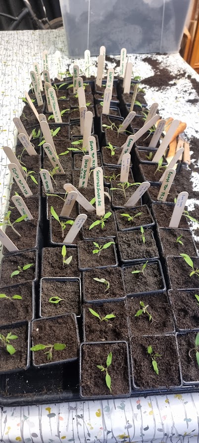 This year, we have the significant advantage of a grow-tent, grow-lights and heat. helping our seedlings. The tomatoes now have their first real leaves and have been pricked out into bigger pots.